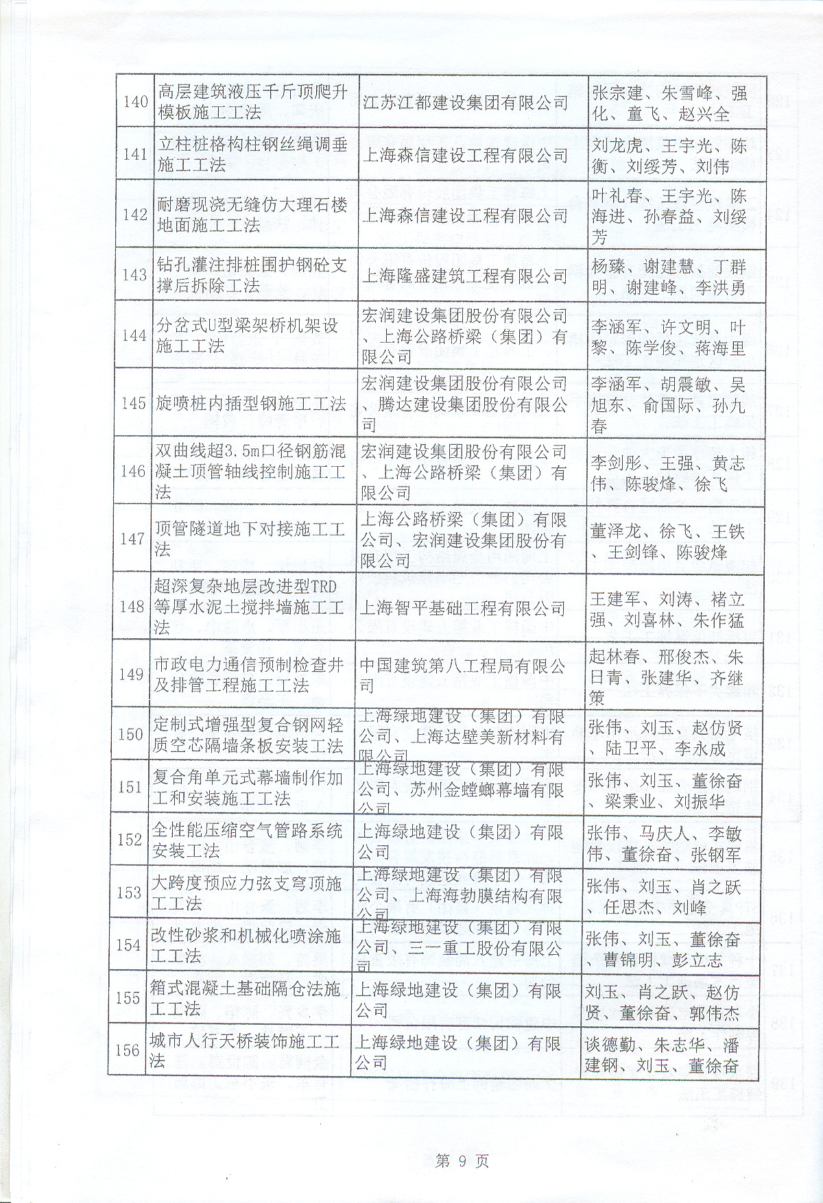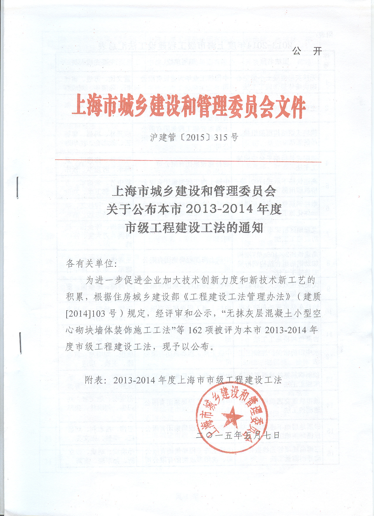 本年度,根据住房城乡建设部《工程建设工法管理办法》(建质【2014】103号)规定,经上海市城乡建设和管理委员会评审和公示,我单位申报的四项工法被评为2013-2014年度上海市市级工法。