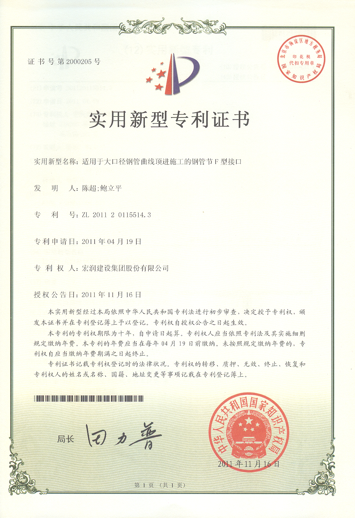 实用新型专利证书-适用于大口径钢管曲线顶进施工的钢管节F型接口