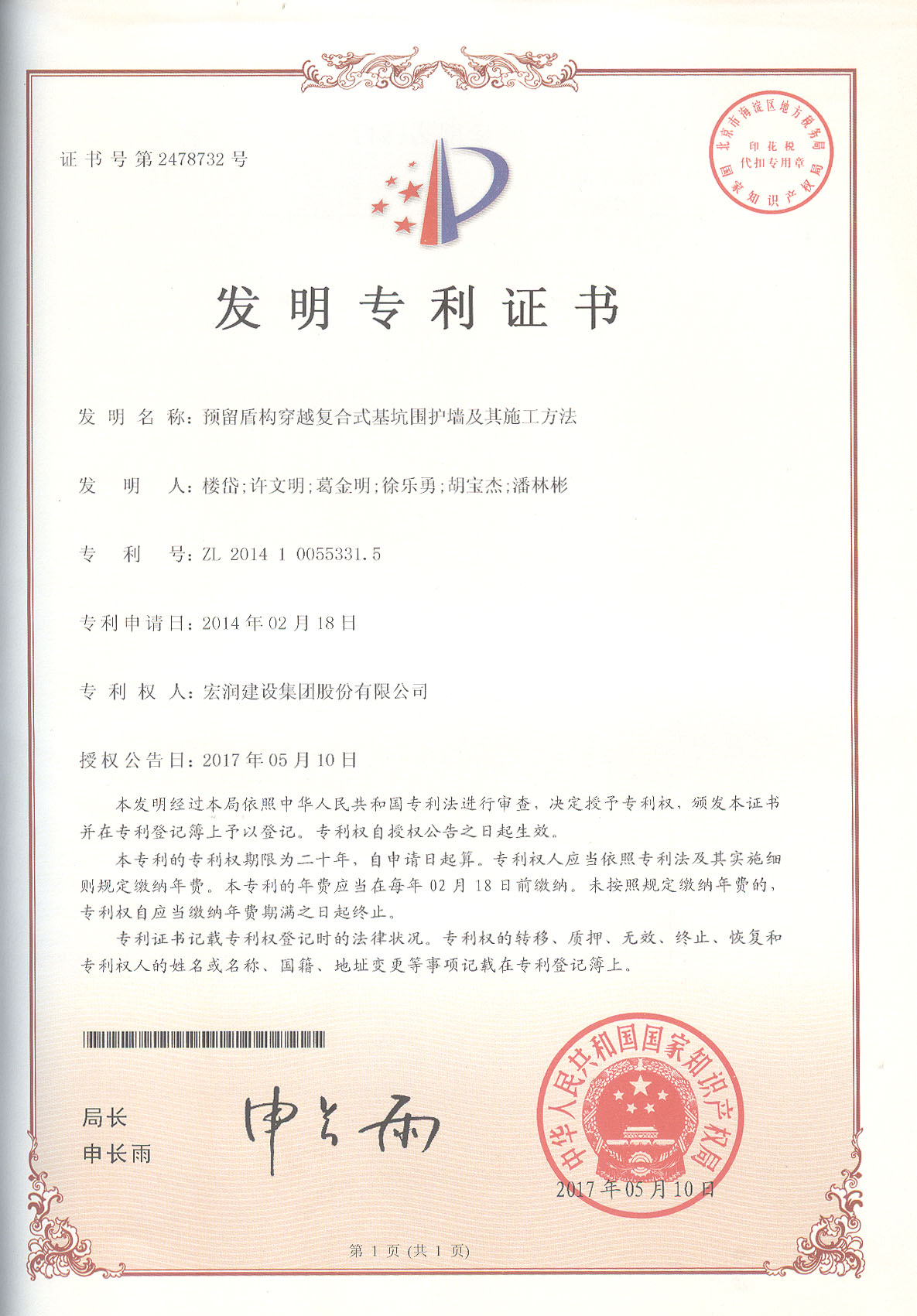 授予发明专利证书-预留盾构穿越复合式基坑围护墙及其施工方法
