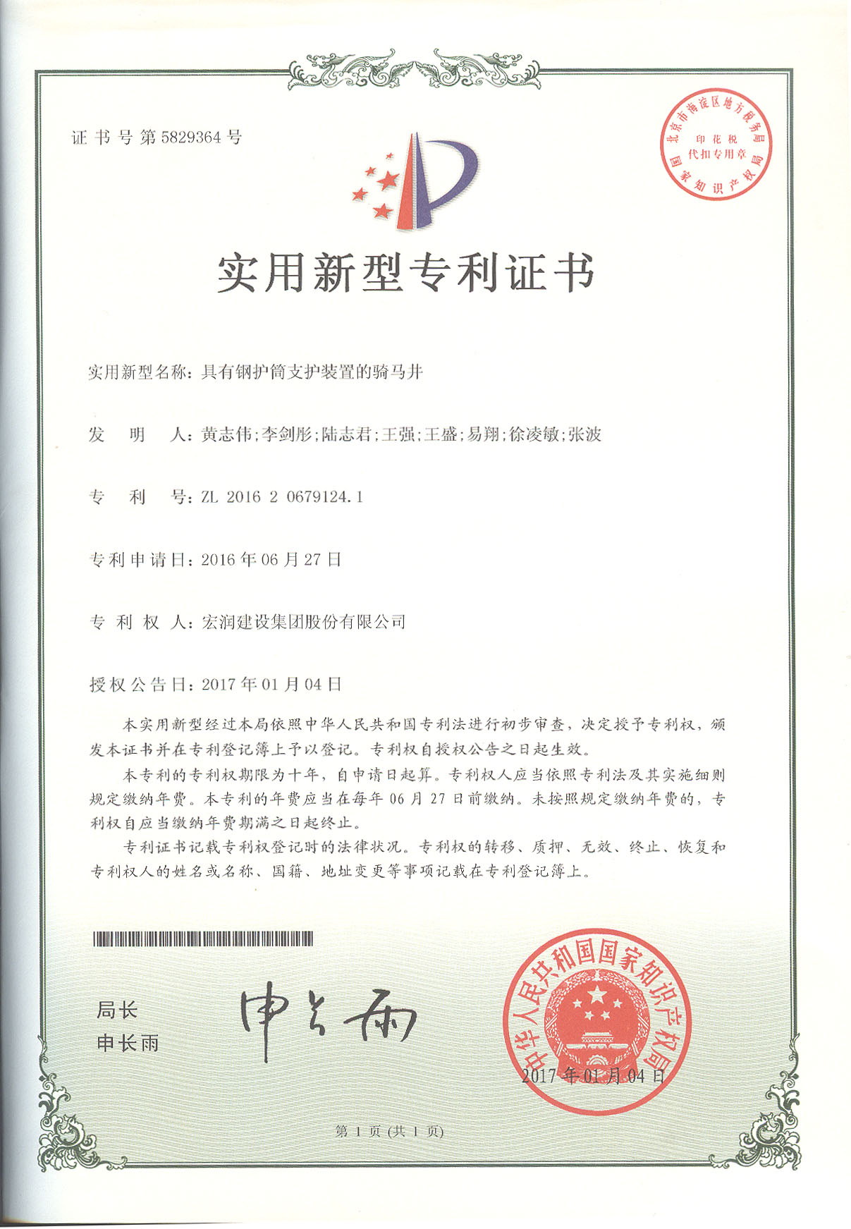 授予实用新型专利证书-具有钢护筒支护装置的骑马井