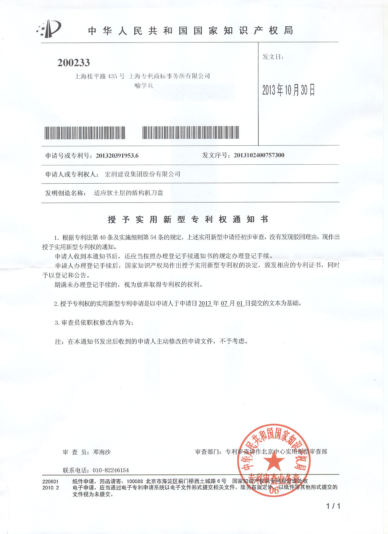 授予实用新型专利权通知书-适应软土层的盾构机刀盘