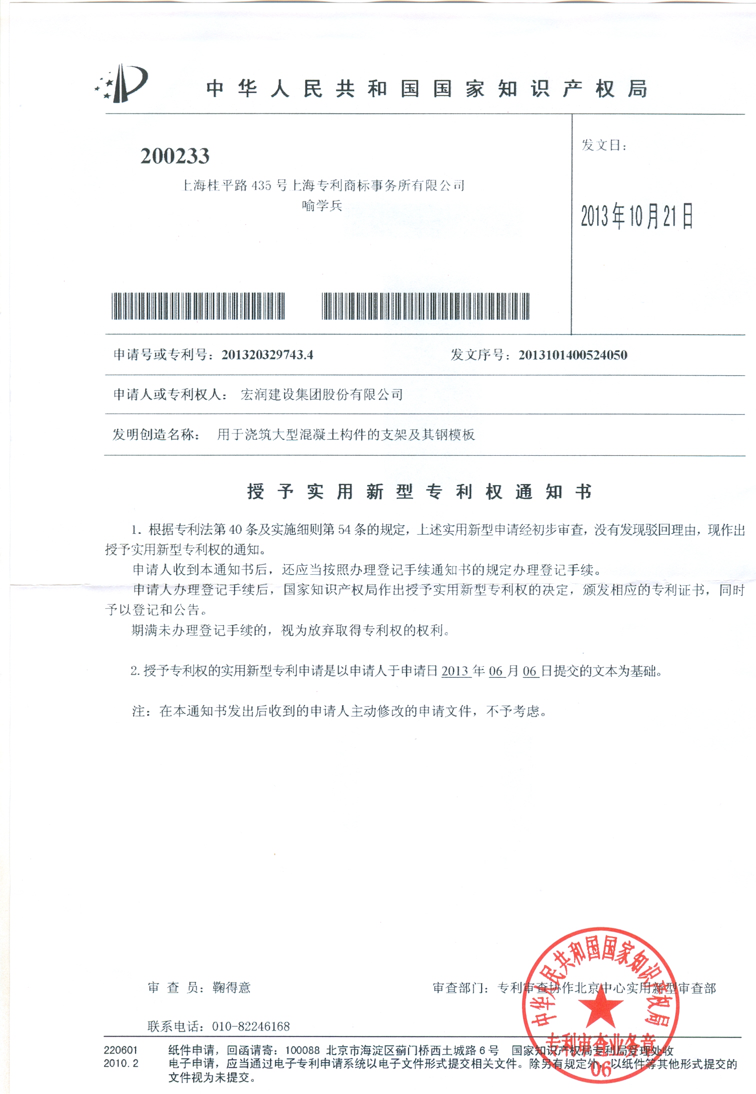授予实用新型专利权通知书-用于浇筑大型混凝土构件的支架及其钢模板