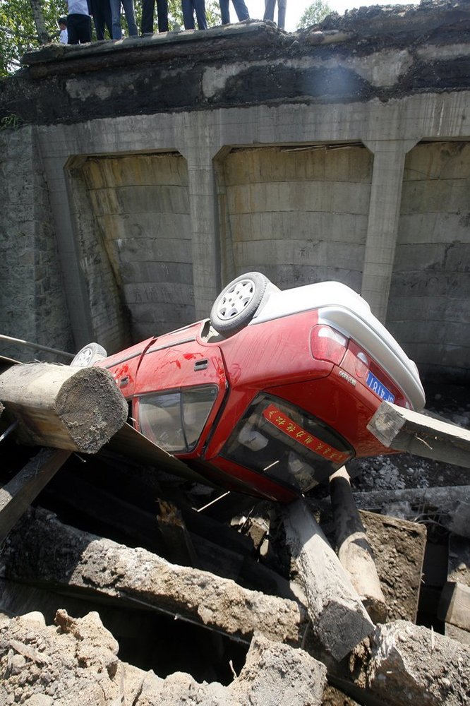 一辆行驶在桥上的大挂货车连同桥面坠入锦江,一辆出租车驶到垮塌大桥处时坠入桥下,货车与出